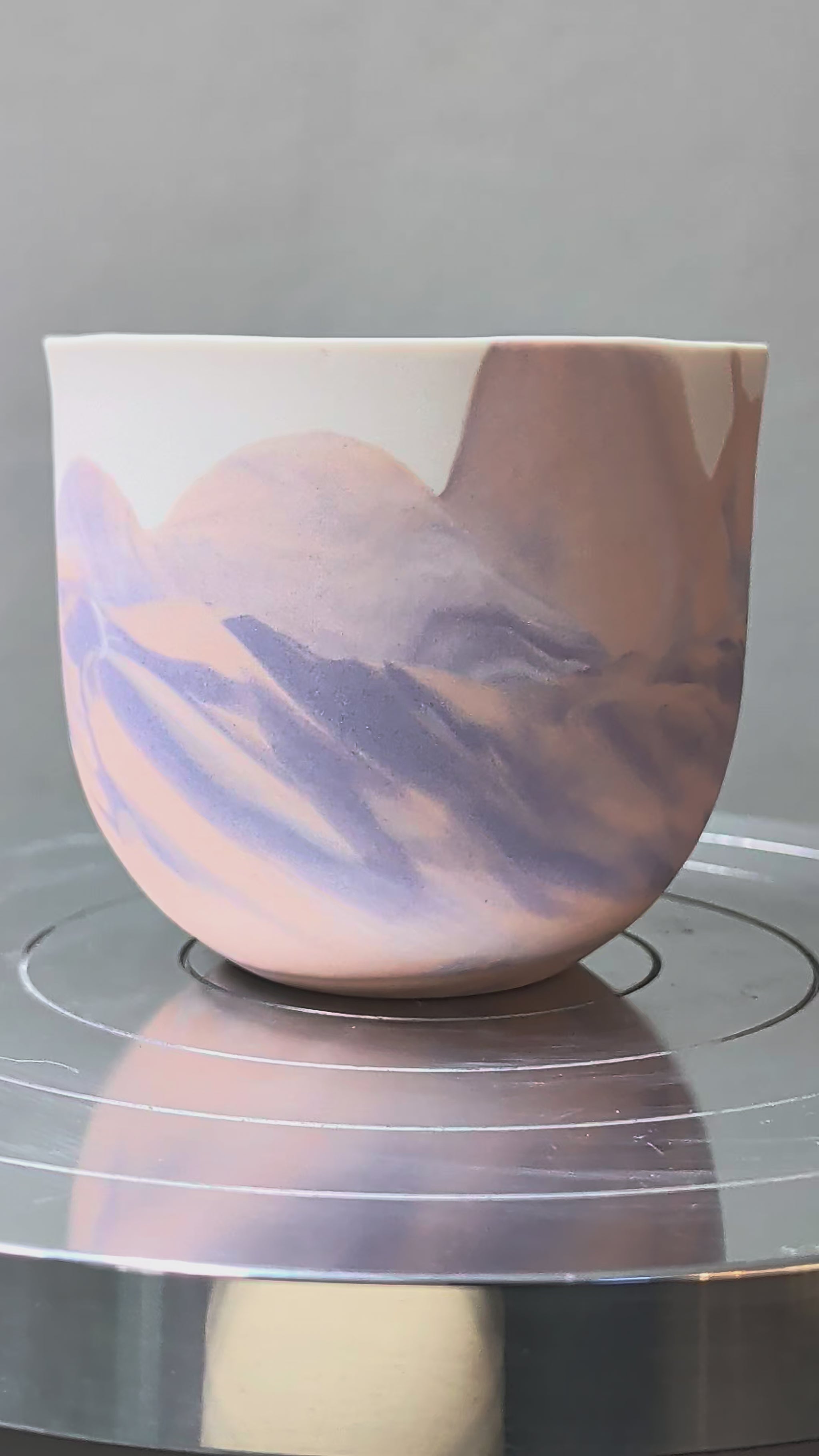 Our Original Flow Cup! Oh how we love this cup! Each one is a unique piece of art. We select the colours and then we lose control over the flow of the pigmented porcelain. The mess we create while making these cups and the ooohhs and aaahhhs we make when we pull them out of the kiln....these are truly the highlights of our week!